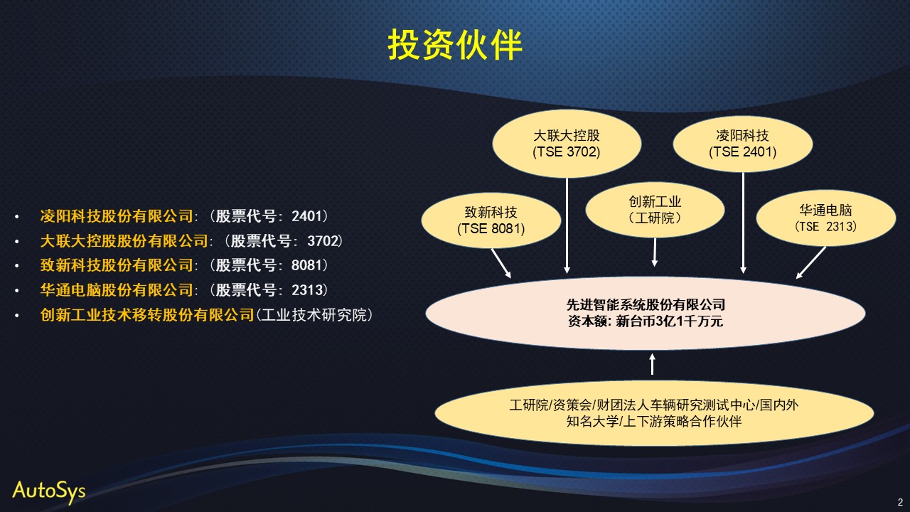 先进智能系统股份有限公司成立于2018年,由英属开曼群岛商AutoSys Co., Ltd.全资成立, 目标成为汽车先进辅助驾驶系统(ADAS)与自动驾驶(ADV)的系统与解决方案领导厂商